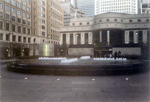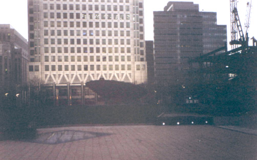 In front of the Houses of Parliament is the appropriately named Parliament Square (TQ 301 796). The clock-tower (often mistakenly called Big Ben, a name which in fact refers to the bell within) is an imposing presence across a square which largely serves to provide tourist photographers a good location. The Thames is directly behind Parliament, and the proximity of Westminster Bridge contributes to a constant queue of traffic alongside the square. Back at Westminster station, just after I heard 4.00 chime in the tower above me, I took the Jubilee Line to Canary Wharf. Night comes early in January, and there was little light left when I reached my final two squares, in Docklands. Cabot Square (TQ 373 803) represents the modern face of corporate London. It sits before, and surrounded by, the new office buildings of this regenerated area of the capital. It is an attractive square, with small fountains, lit up at night. My first impression was that it was kind of soulless. The stark lines of the buildings around, and the features of the square, planned down to the last detail, deprived it of some of the feeling of life of many of the old squares within the boundaries of the Circle Line. I am not so sure now; I think it has a presence of a different kind, and the central raised and partially enclosed section provides a calm but formal break from the high-rises towering above. Here's another image of the square. Number 1, Canada Square, is an address maybe not known to all Londoners - but they doubtlessly know the building at that address, the tower popularly known simply as 'Canary Wharf'. Canada Square (TQ 375 803) itself is a pleasant expanse of grass, with a bizarre saucer-shaped thing in the middle. When I was there, building works were in progress either side of the square on the pair of towers which were to be the new addition to the docklands skyline. I jumped on the tube again at Canary Wharf underground station, a grand and fascinating example of modern architecture, and a key new stop on the recent extension to the Jubilee Line which takes the line out from Westminster east to Docklands and beyond. By the time I left the underground, night had fallen completely. |